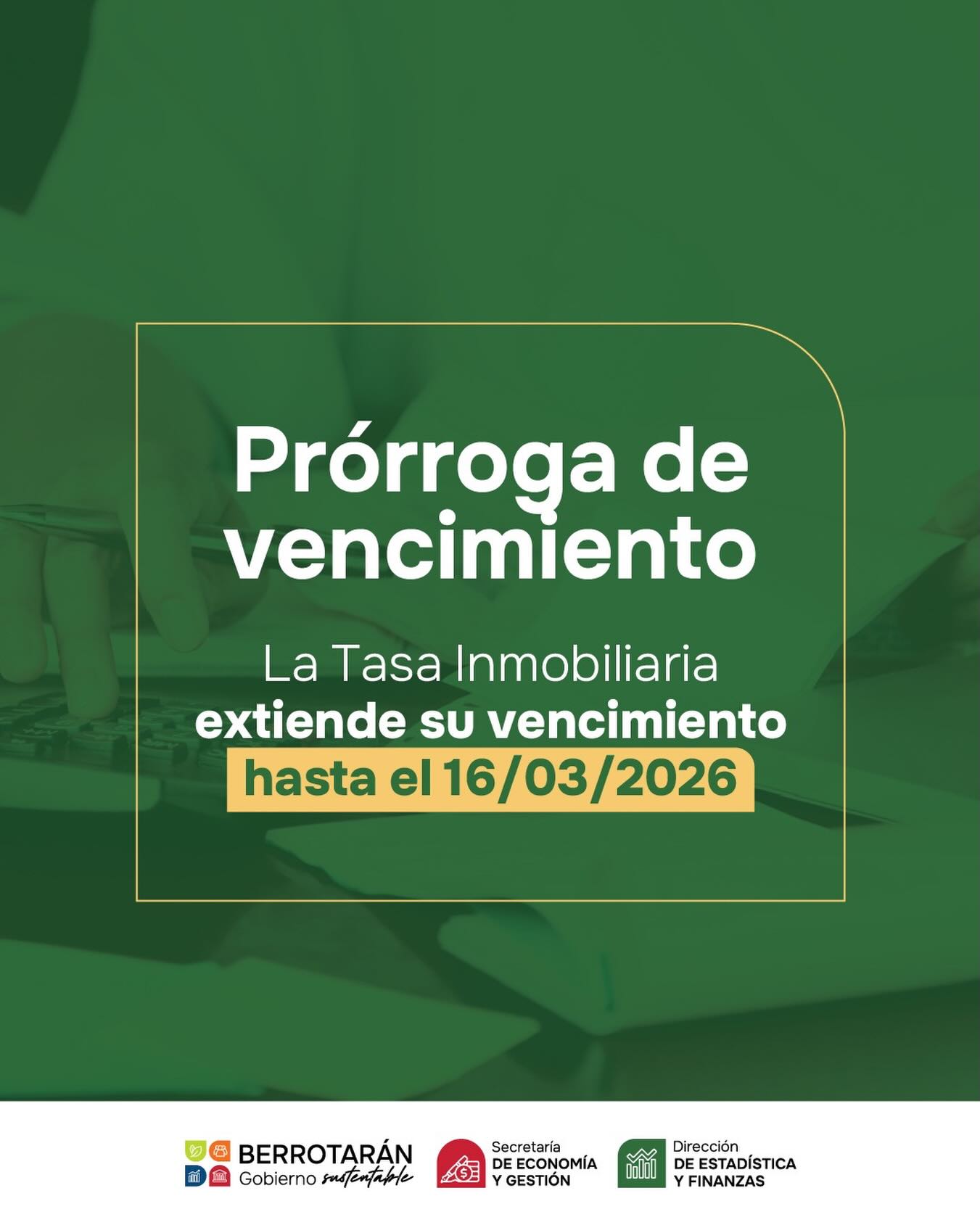La Municipalidad de Berrotarán resolvió prorrogar el vencimiento del pago anual de la Tasa Inmobiliaria hasta el 16 de marzo de 2026.